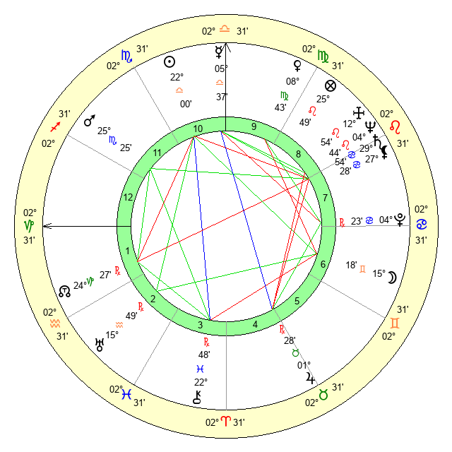 | Moon | 15 Gemini 24 | 16 Leo 31 | 13 Gemini 9 |