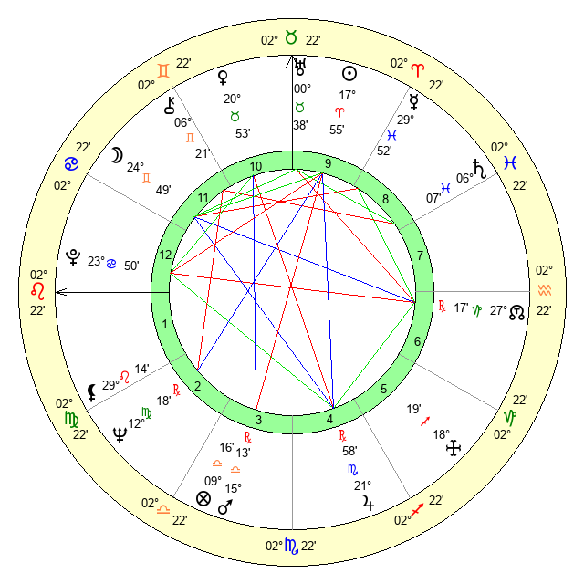 | Sun | 17 Aries 56 | 19 Aries 6 | 14 Cancer 38 |