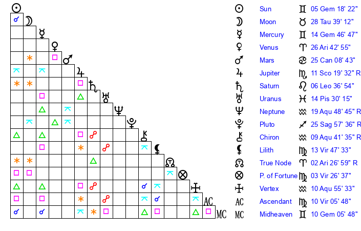| Mercury | 14 Gemini 47 | 1 Gemini 27 | 17 Cancer 23 |