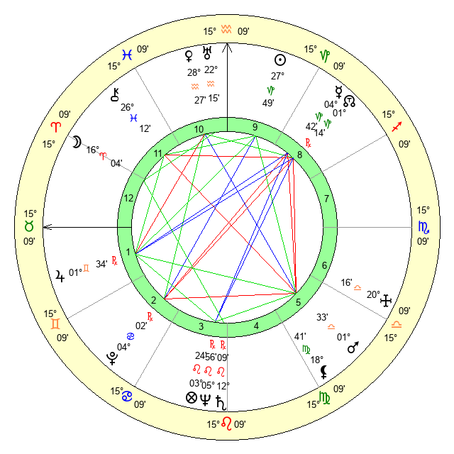 | Moon | 16 Aries 1 | 24 Virgo 40 | 7 Pisces 42 |