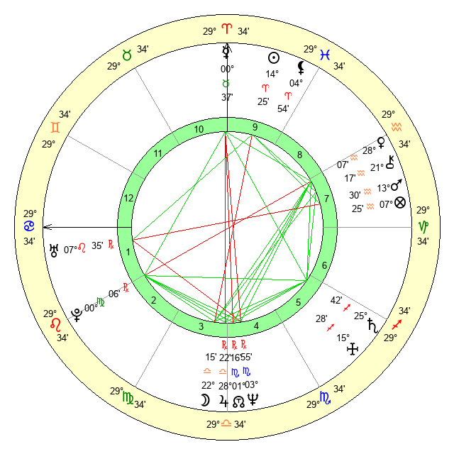| Moon | 22 Libra 16 | 10 Cancer 26 | 4 Aries 44 |