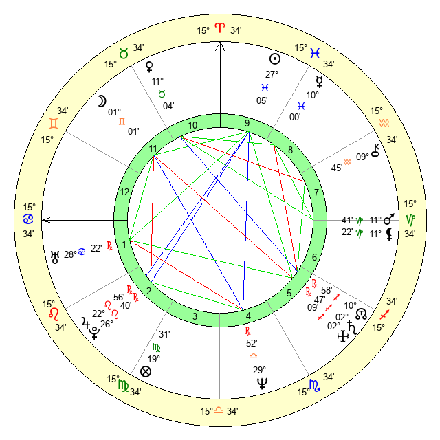 | Moon | 1 Gemini 6 | 4 Scorpio 33 | 16 Sagittarius 14 |