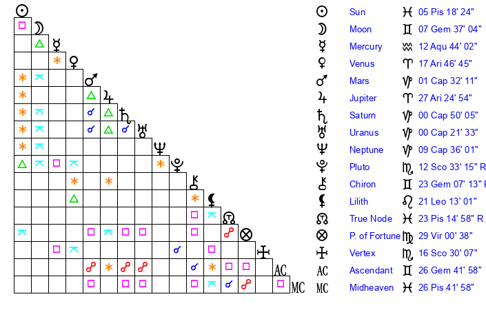 | Sun | 5 Pisces 18 | 6 Pisces 20 | 12 Aries 11 |
