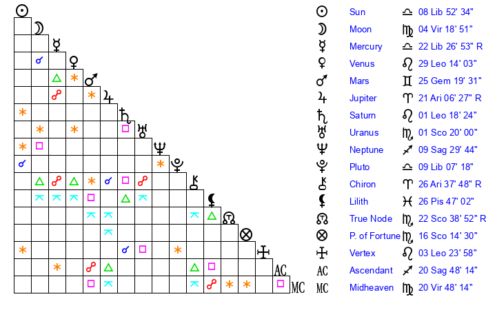 Pluto | 9 Libra 7 | 1 Aquarius 23 | 10 Libra 54 |