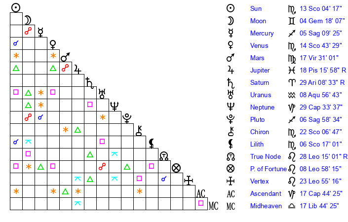 | Sun | 13 Scorpio 4 | 13 Scorpio 32 | 10 Sagittarius 19 |