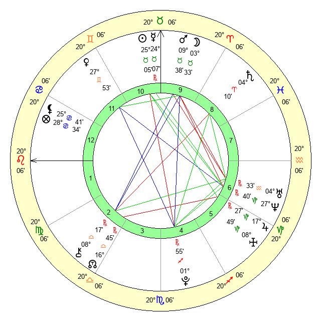 | Mars | 9 Taurus 38 | 12 Leo 38 | 0 Gemini 45 |