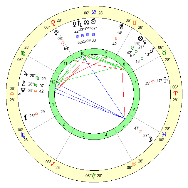 | Mercury | 22 Cancer 54 | 3 Leo 37 | 12 Virgo 1 |