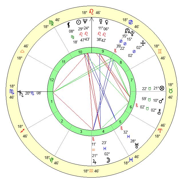 | Moon | 2 Pisces 21 | 6 Virgo 7 | 14 Libra 51 |