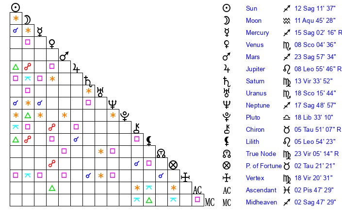 Neptune | 17 Sagittarius 49 | 27 Pisces 7 | 19 Sagittarius 28 |