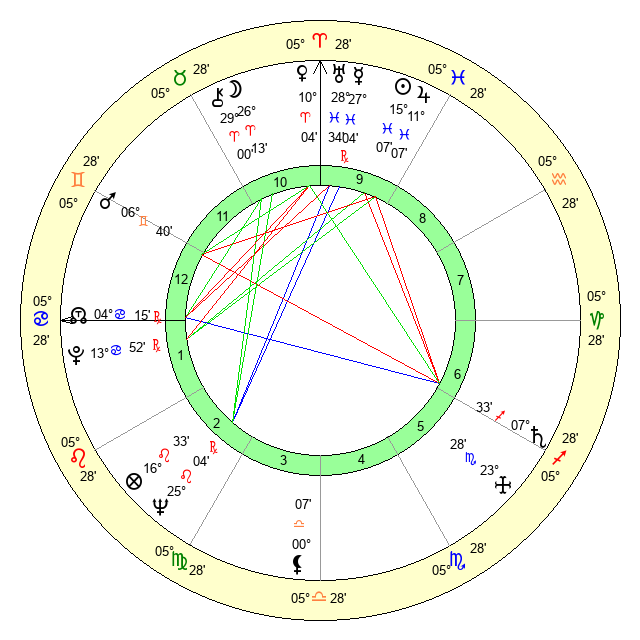 | Jupiter | 11 Pisces 5 | 12 Gemini 46 | 0 Aries 46 |