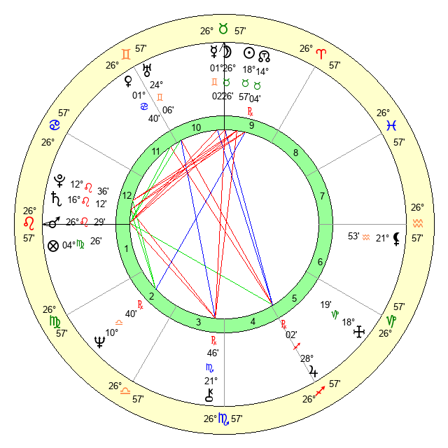 | Moon | 26 Taurus 33 | 16 Libra 39 | 23 Pisces 4 |