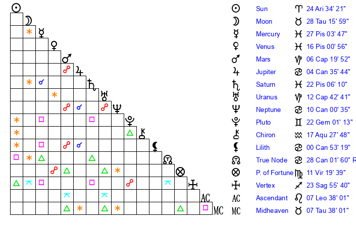 Moon | 28 Taurus 14 | 25 Scorpio 10 | 15 Virgo 24 |