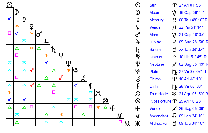 | Sun | 27 Aries 1 | 27 Aries 56 | 19 Gemini 9 |