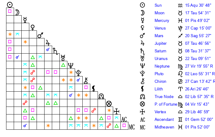 | Sun | 15 Aquarius 31 | 16 Aquarius 8 | 8 Taurus 58 |