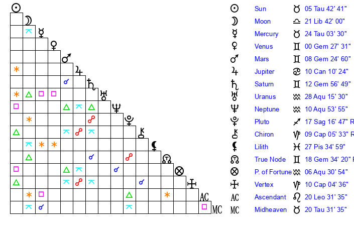 | Moon | 21 Libra 48 | 12 Aries 14 | 18 Leo 58 |