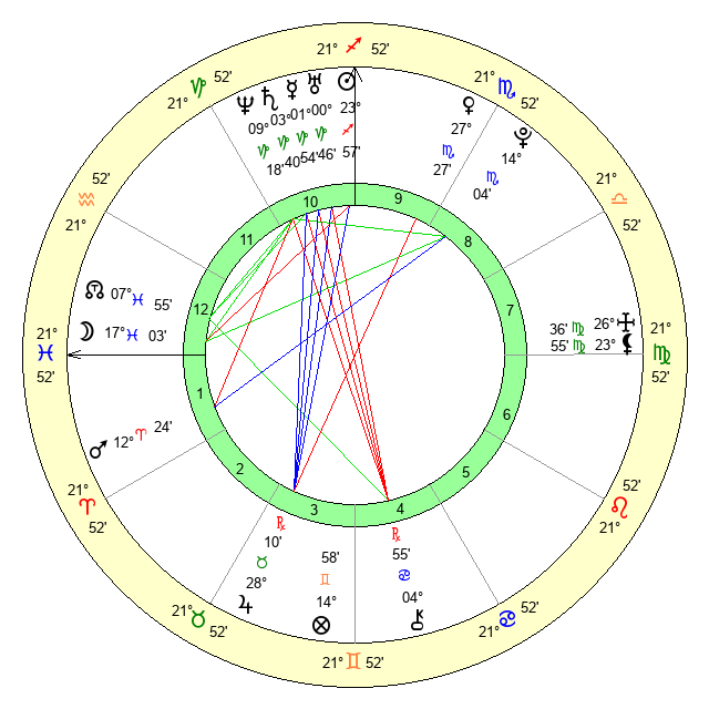 | Moon | 17 Pisces 1 | 6 Scorpio 26 | 29 Cancer 21 |