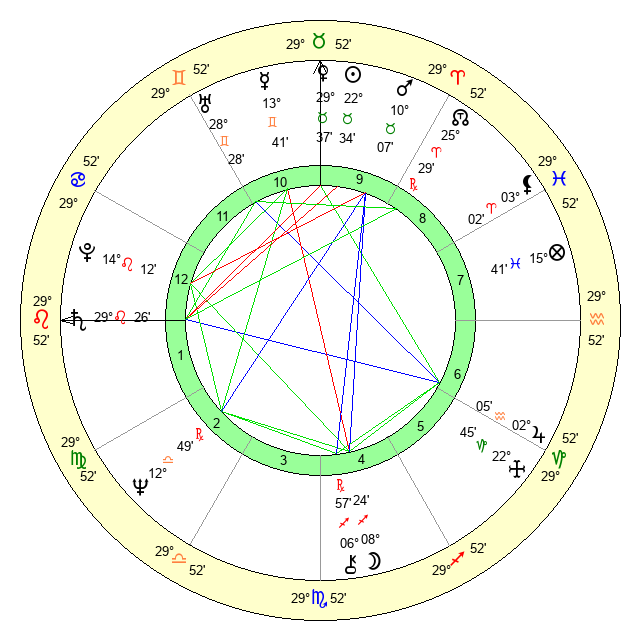 | Saturn | 29 Leo 57 | 28 Pisces 58 | 5 Virgo 39 |