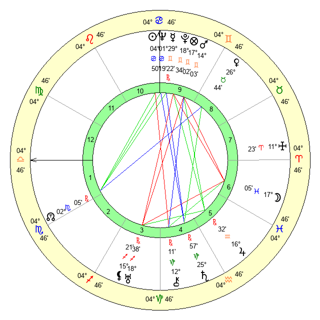 | Mars | 14 Gemini 4 | 5 Virgo 44 | 2 Virgo 35 |