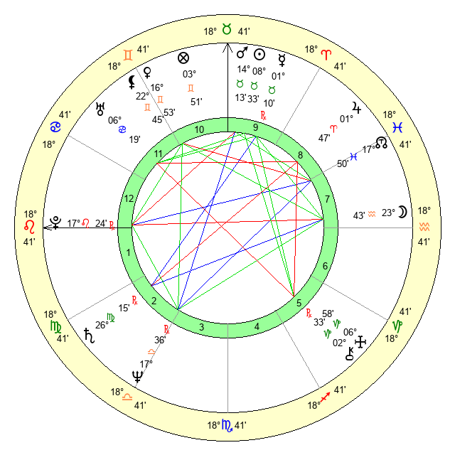 | Moon | 23 Aquarius 43 | 6 Gemini 33 | 25 Libra 46 |
