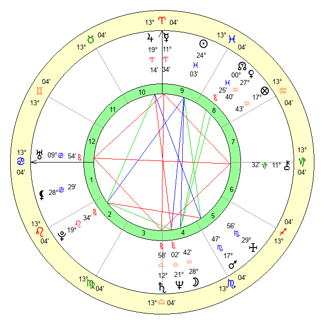 | Moon | 28 Libra 45 | 28 Virgo 52 | 8 Cancer 31 |