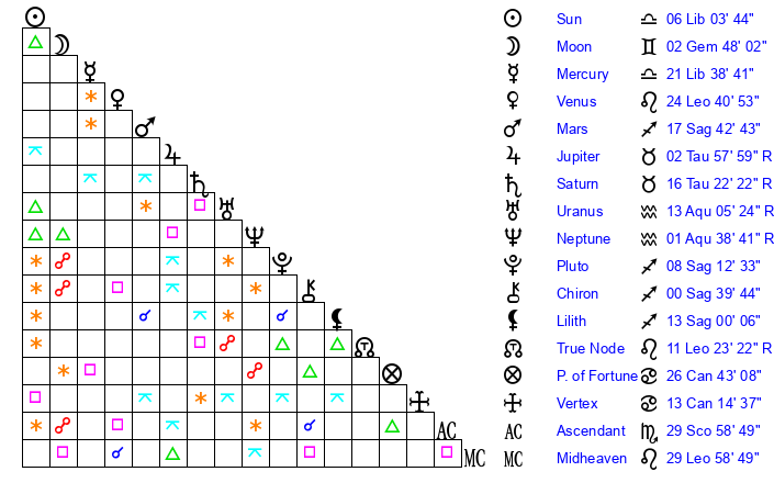 | Mercury | 21 Libra 39 | 19 Libra 3 | 25 Scorpio 53 |