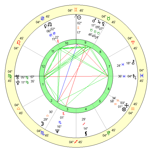 | Sun | 2 Gemini 17 | 2 Gemini 32 | 0 Leo 34 |