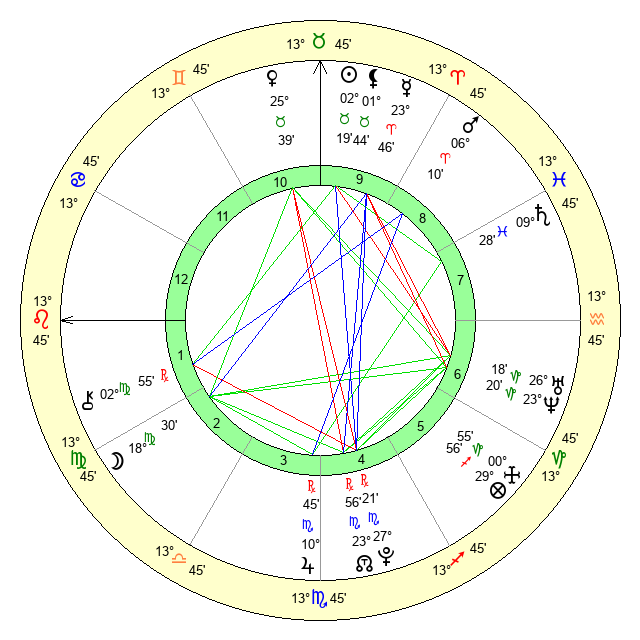 | Moon | 18 Virgo 34 | 22 Aquarius 59 | 12 Scorpio 3 |