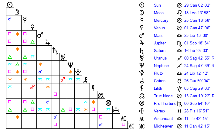 | Venus | 1 Cancer 47 | 19 Gemini 40 | 24 Leo 10 |