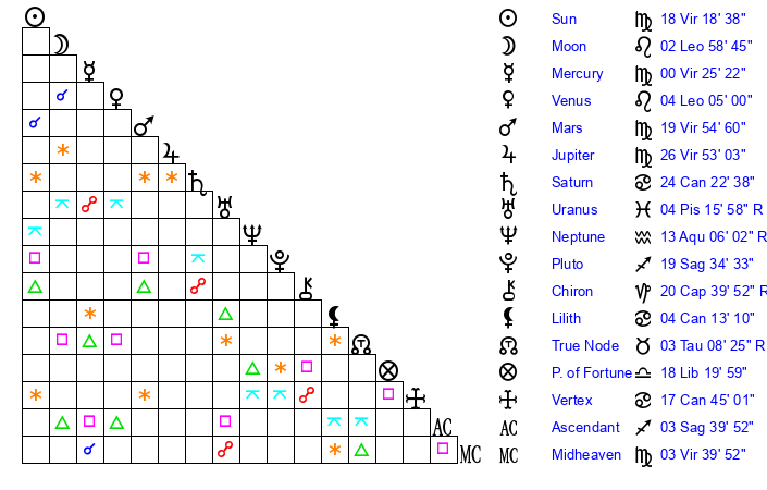 | Sun | 18 Virgo 19 | 18 Virgo 14 | 8 Libra 51 |