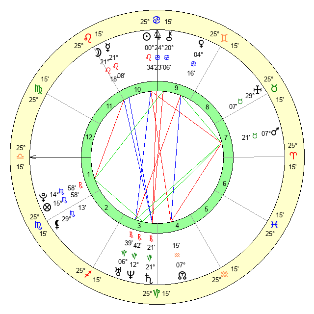 | Moon | 21 Leo 16 | 16 Cancer 48 | 27 Scorpio 40 |
