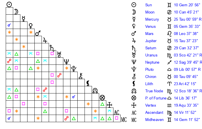 | Sun | 10 Gemini 20 | 10 Gemini 29 | 27 Cancer 7 |