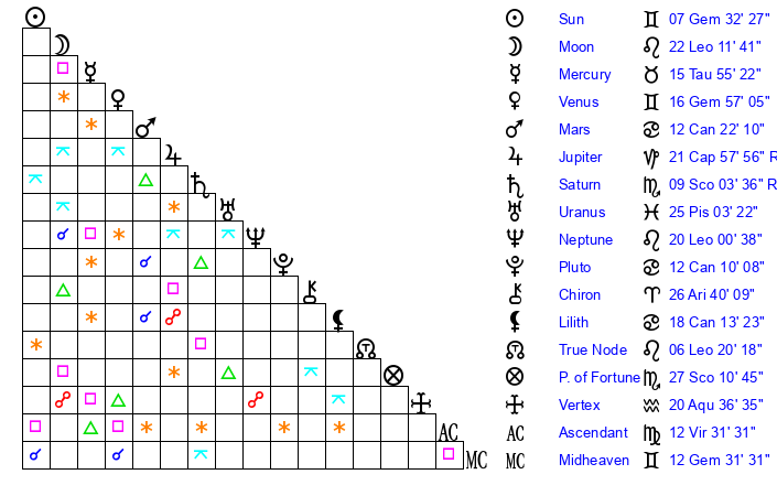 Venus | 16 Gemini 58 | 22 Aries 31 | 18 Libra 32 |