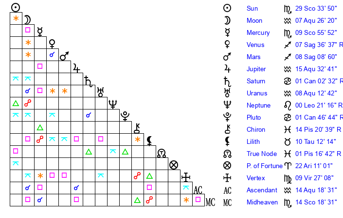 Sun | 29 Scorpio 34 | 0 Sagittarius 53 | 21 Pisces 2 |