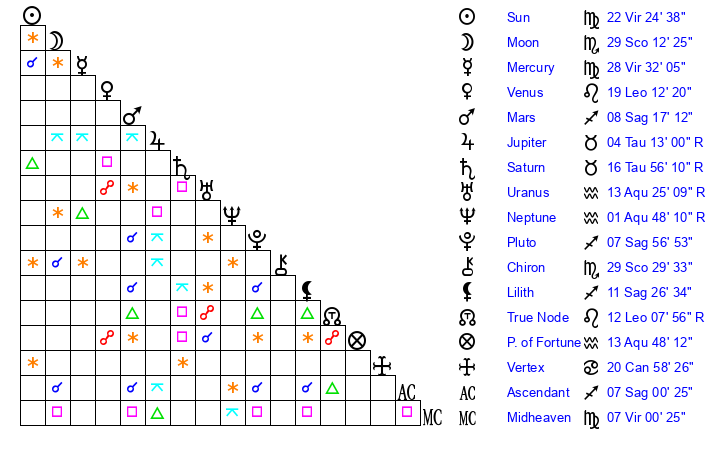 Mercury | 28 Virgo 33 | 25 Virgo 5 | 9 Scorpio 12 |