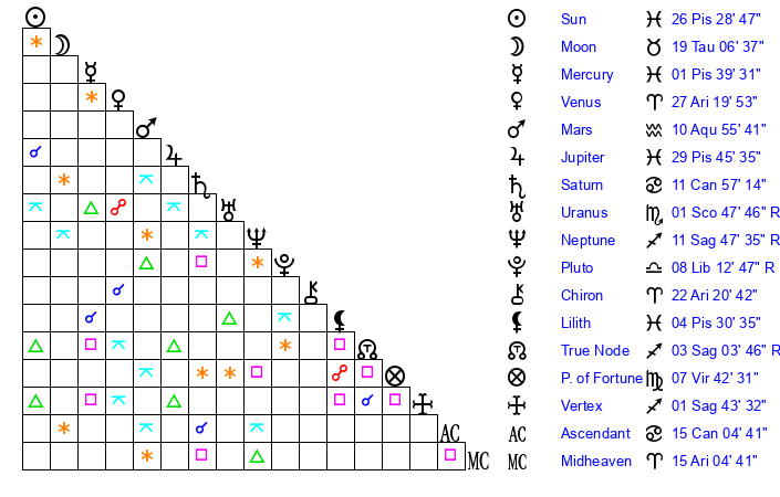Sun | 26 Pisces 28 | 27 Pisces 21 | 15 Taurus 32 |