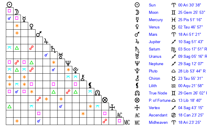 Sun | 0 Aries 31 | 1 Aries 20 | 11 Taurus 44 |