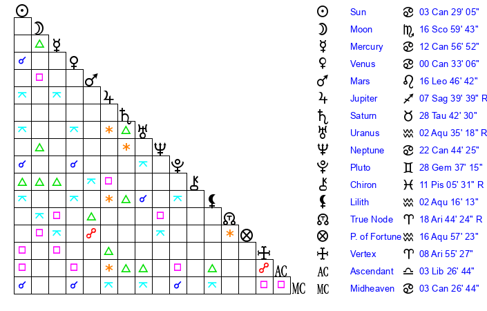 | Moon | 16 Scorpio 57 | 4 Cancer 23 | 4 Capricorn 49 |
