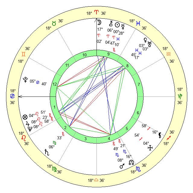 | Sun | 0 Aries 47 | 1 Aries 20 | 12 Cancer 22 |