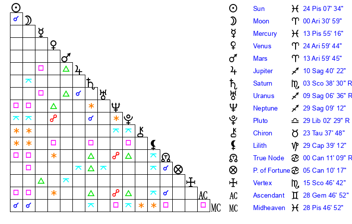| Sun | 24 Pisces 8 | 24 Pisces 57 | 5 Taurus 29 |