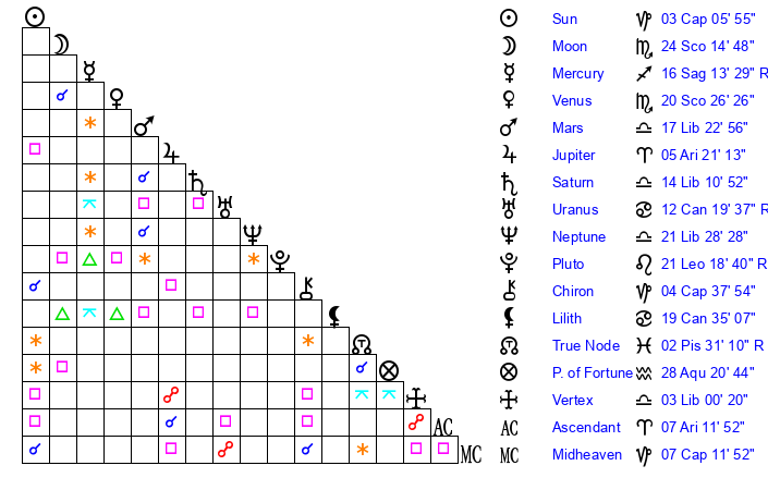 Sun | 3 Capricorn 6 | 4 Capricorn 24 | 17 Pisces 4 |