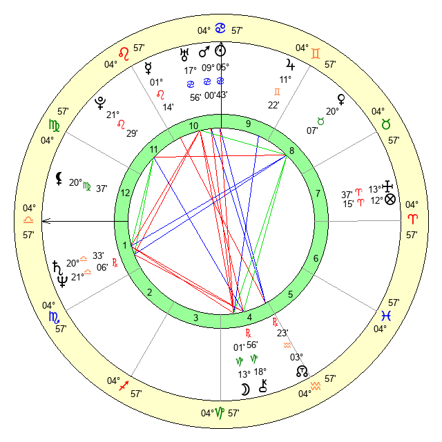 | Sun | 5 Cancer 43 | 6 Cancer 18 | 14 Virgo 45 |