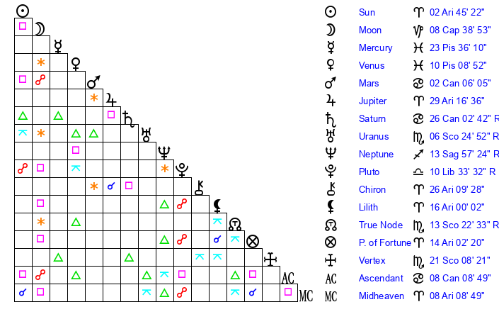 | Neptune | 13 Sagittarius 56 | 29 Pisces 43 | 13 Sagittarius 10 |