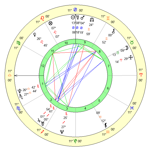 | Mars | 4 Cancer 20 | 10 Virgo 31 | 1 Leo 57 |