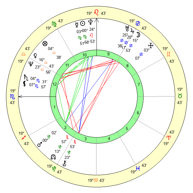 | Sun | 0 Virgo 58 | 1 Virgo 47 | 10 Scorpio 44 |