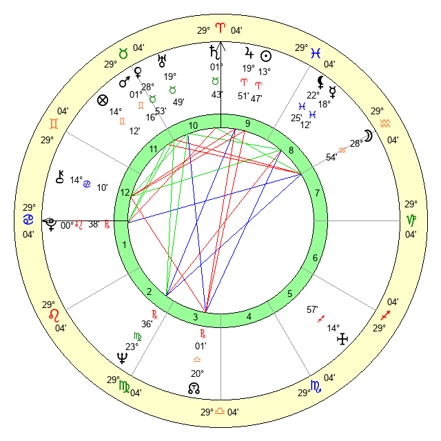 | Sun | 13 Aries 47 | 14 Aries 11 | 5 Cancer 51 |