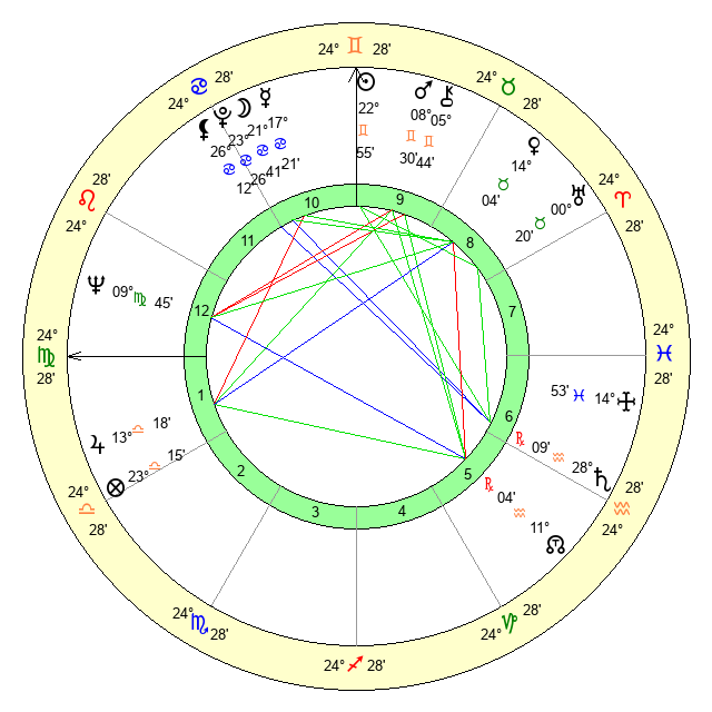 | Sun | 22 Gemini 55 | 23 Gemini 53 | 20 Virgo 12 |