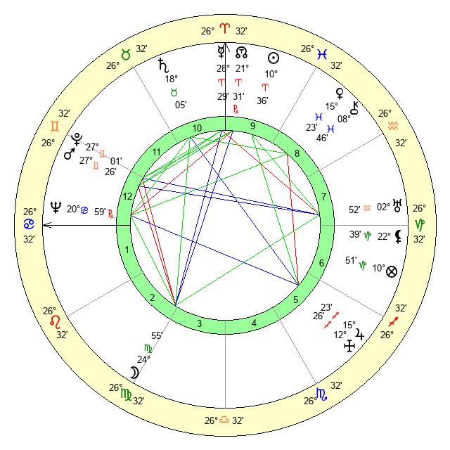 | Moon | 24 Virgo 58 | 12 Taurus 59 | 17 Scorpio 17 |
