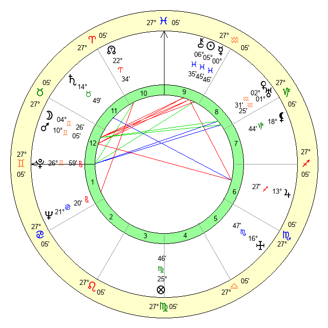 | Sun | 5 Pisces 45 | 7 Pisces 20 | 26 Gemini 5 |