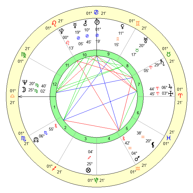 | Sun | 1 Cancer 19 | 2 Cancer 29 | 23 Virgo 53 |
