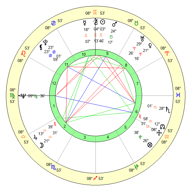 | Sun | 3 Gemini 46 | 4 Gemini 44 | 0 Virgo 49 |